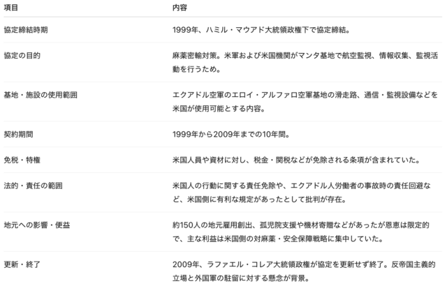 このような状況の中、米国はエクアドルにおける軍事的プレゼンスを新たに確保することで、地域における監視能力および情報収集(インテリジェンス)の体制を維持・強化しようとしていると、前述の学術記事は指摘している。米国の戦略的関心は、単に基地の地理的配置にとどまらず、南米および中米地域における影響力の確保という広範な文脈の中で展開されていると考えられる。