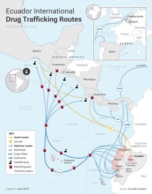 2019年の地図は、『ミリタリー・レビュー』誌の記事内に掲載されているが、エクアドルから欧州へ向かう麻薬密輸ルートについては一切の記述がない。同ルートは、エクアドルを起点とする麻薬組織の主要な輸出経路の一つでありながら、これを無視している点は注視に値する。