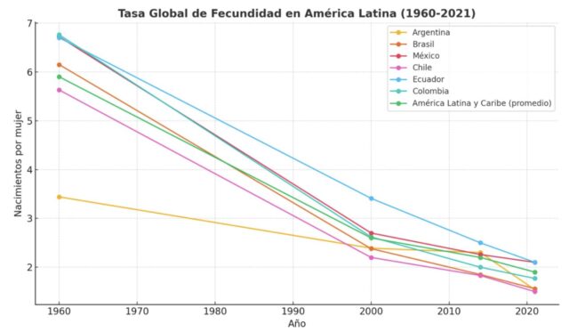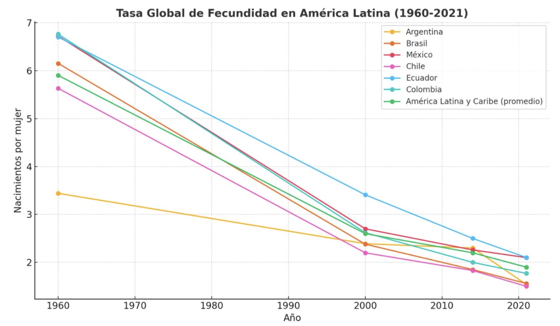 この傾向は、ラテンアメリカおよびカリブ地域において明らかである。ラテンアメリカおよびカリブ地域において、出生率の低下傾向は顕著である。地域全体の合計特殊出生率は、2000年には女性1人あたり2.6人であったが、2023年には1.78人にまで減少し、人口置換水準を大きく下回る水準となっている。各国の状況を見ると、ブラジルでは2000年の2.4人から2023年には1.75人に低下した。メキシコでは2.7人から1.73人へ、チリでは2.2人から1.75人へと減少している。コロンビアも同様に2.6人から1.94人に下がった。歴史的に出生率が高かったエクアドルにおいても、2000年の3.1人から2023年には2.24人へと著しい減少が見られる。アルゼンチンもこの傾向に沿っており、2014年以降は出生率が持続的に低下している。2023年には1,000人あたり約12人の出生数となり、地域全体の動向と一致している。ラテンアメリカ・カリブ経済委員会(Comisión Económica para América Latina y el Caribe:CEPAL)は、社会的に深刻な不平等と雇用の不安定性が特徴的なこの地域において、急速な高齢化が進んでいることを指摘している。