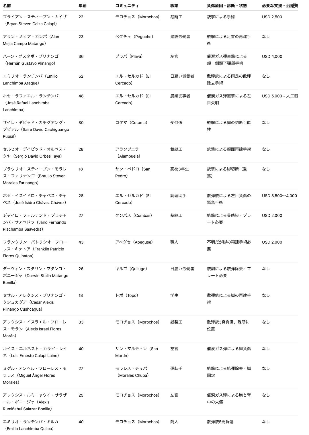 被害者の多くは、ペグチェ(Peguche)、サン・ペドロ(San Pedro)、コタマ(Cotama)、サン・イグナシオ(San Ignacio)、エル・セルカド(El Cercado)などの先住民コミュニティに属し、建設業、縫製業、日雇い労働に従事していた。特に深刻なケースとしては、ホセ・ラファエル・ランチンバ(José Rafael Lanchimba、48歳)が挙げられる。彼は催涙ガス弾の直撃を受け、左目を失明した。また、インティ・パカリ・コルドバ(Inti Pakari Córdoba)はサン・イグナシオ出身の日雇い労働者で、股関節全置換手術を受けざるを得なかった。さらに、エルナン・グスタボ・プリナンゴ(Hernán Gustavo Plinango、36歳)は顔面に受けた催涙ガス弾の負傷により外科手術を受けている。多くの負傷者は義肢、金属プレート、継続的な治療を必要としており、治療費は5,000米ドルを超える高額に上っている。