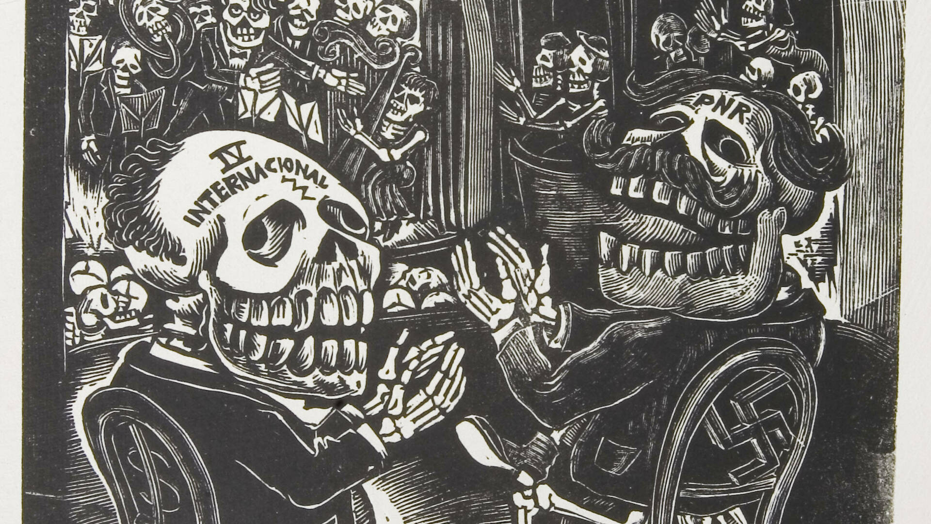 ポサダの芸術において、骸骨は最も象徴的なモチーフであった。彼は骸骨を通して、「金持ちも貧乏人も、最後は皆同じ墓場に行く」という死の平等性を、皮肉とユーモアをもって描き出した。骸骨たちは笑い、踊り、働き、遊びながら、社会の矛盾や人間の愚かさを風刺した。