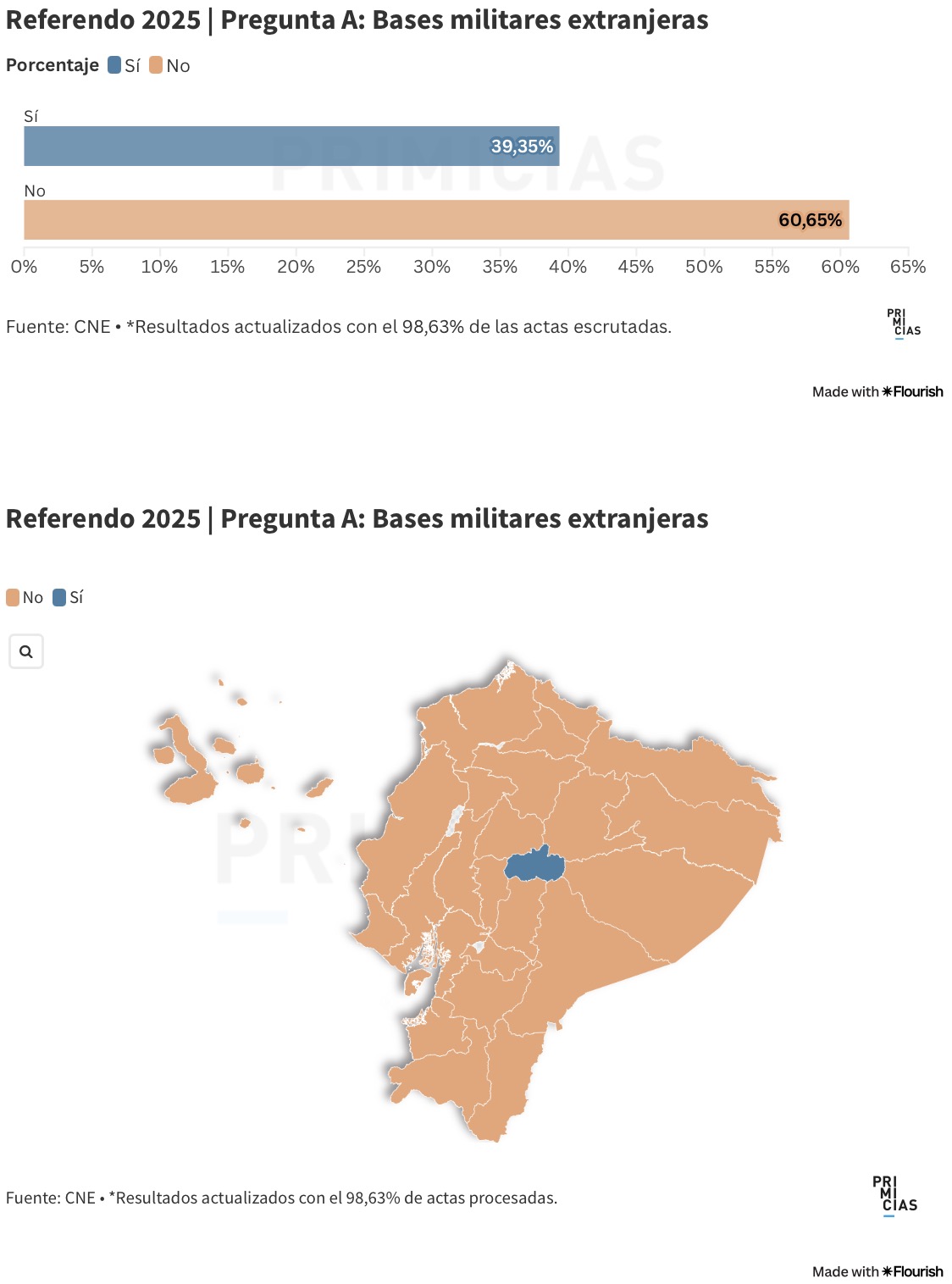 ノボアがエクアドルにおける組織犯罪の増加を受けて推進した外国基地の設置に関する質問や、その他の制度改革に関連する質問は、米国との軍事協力や、この種の安全保障協定の範囲に関して、地域全体で激しい議論を巻き起こしていた。ノボアが犯罪組織と戦う手段として外国部隊の受け入れを許可する提案を提示したためである。CNEが公表したデータでは、上述のとおり4つの質問すべてで「反対」が勝利しているが、軍事基地設置に関する質問と、憲法改正議会の招集に関する質問は、拒否の割合が最も高かった。