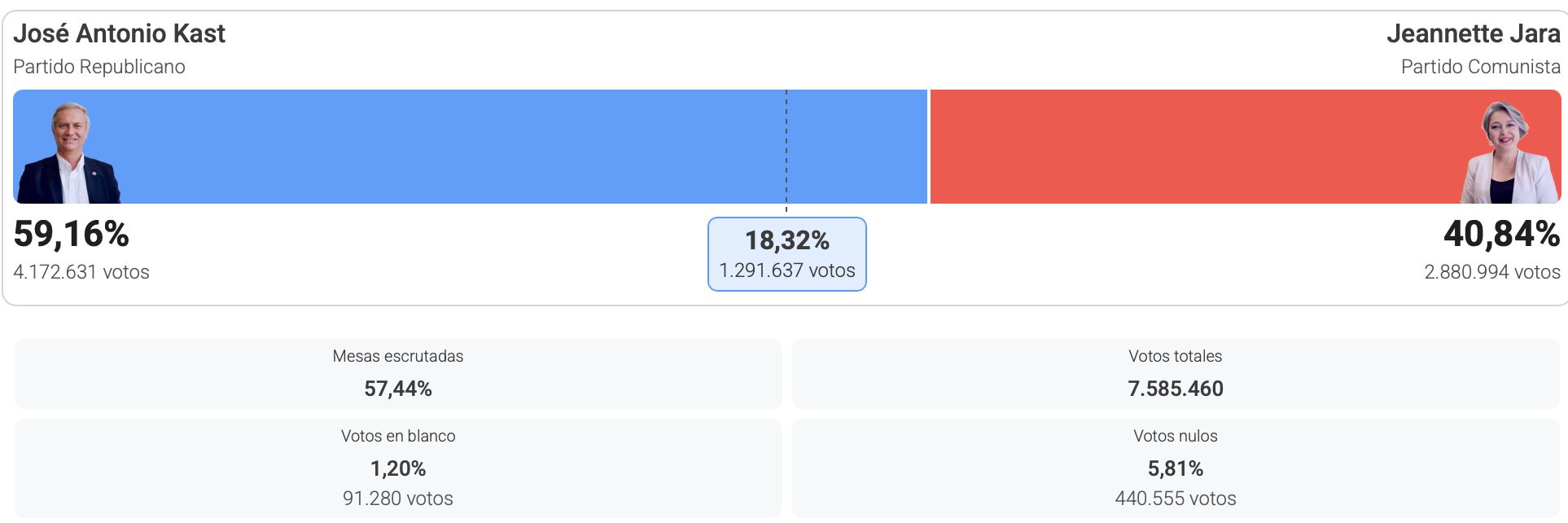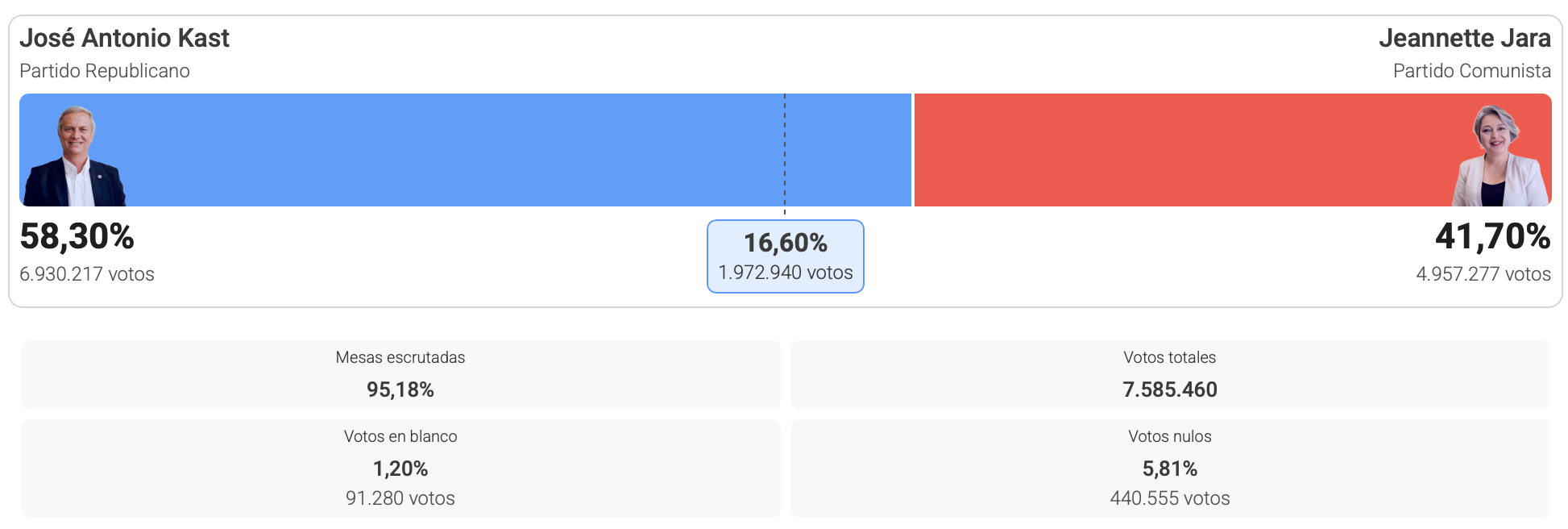 チリ大統領決選投票で、共和党候補のホセ・アントニオ・カストが左派候補のジャネット・ハラを破り、次期大統領に選出された。カストは約60%の得票を獲得し、ハラの40%を大きく上回った。