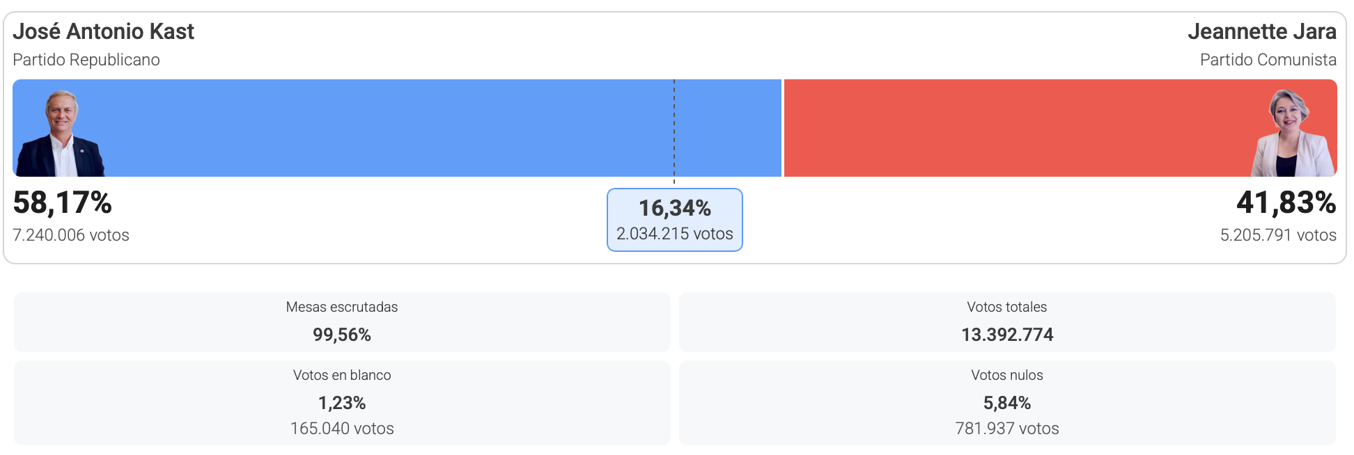 カストの勝利は、治安危機への対応、30万人以上の不法移民の国外退去、北部国境の閉鎖、経済回復の訴えなどを中心とした選挙戦略が支持された結果とされる。各種世論調査や専門家の予測通りの結果であるものの、実際の得票差はさらに大きかった。カストは2026年3月11日に正式に大統領に就任する予定である。
