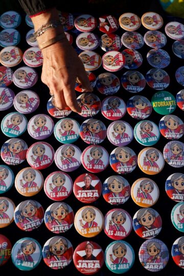 A person picks out lapel pins of Chile’s presidential candidate Jeannette Jara, of the Unidad por Chile coalition, ahead of her closing campaign rally in Santiago on Dec.10, 2025.