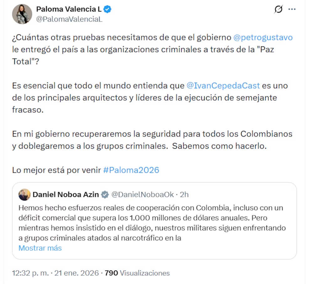 民主中道党(Centro Democratico)所属の大統領候補であるパロマ・バレンシア(Paloma Valencia)も、エクアドル政府の決定に遺憾の意を示した。バレンシアは、「いったいどれほど多くの証拠があれば、ペトロ政権が『包括的和平』政策を通じて国を犯罪組織に明け渡した事実を理解できるのか」と疑問を呈し、イバン・セペダ(Iván Cepeda)がこの失敗の主要な設計者であり実行者の一人であると批判した。