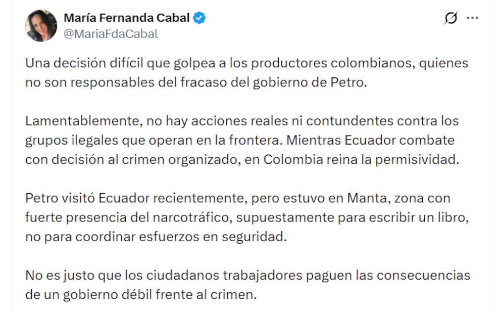 同様に、コロンビアの上院議員であるマリア・フェルナンダ・カバル(María Fernanda Cabal)も、今回の関税措置の責任はペトロ大統領にあると主張し、その影響が主としてコロンビアの生産者に及ぶ点を問題視した。カバルは、「これはコロンビアの生産者を直撃する厳しい決定であり、彼らはペトロ政権の失敗に責任を負う立場にはない。国境で活動する違法組織に対する実効的で断固たる行動は見られない」と述べ、エクアドルが組織犯罪と強硬に対峙している一方で、コロンビアでは寛容さが支配していると批判した。さらにカバルは、ペトロ大統領がダニエル・ノボア大統領の就任式出席後にエクアドルのマンタを訪問したことにも言及し、「治安協力の調整ではなく、書籍執筆のための訪問だったとされている。犯罪に対して弱腰な政府の代償を、真面目に働く市民が支払うのは不当である」と述べた。