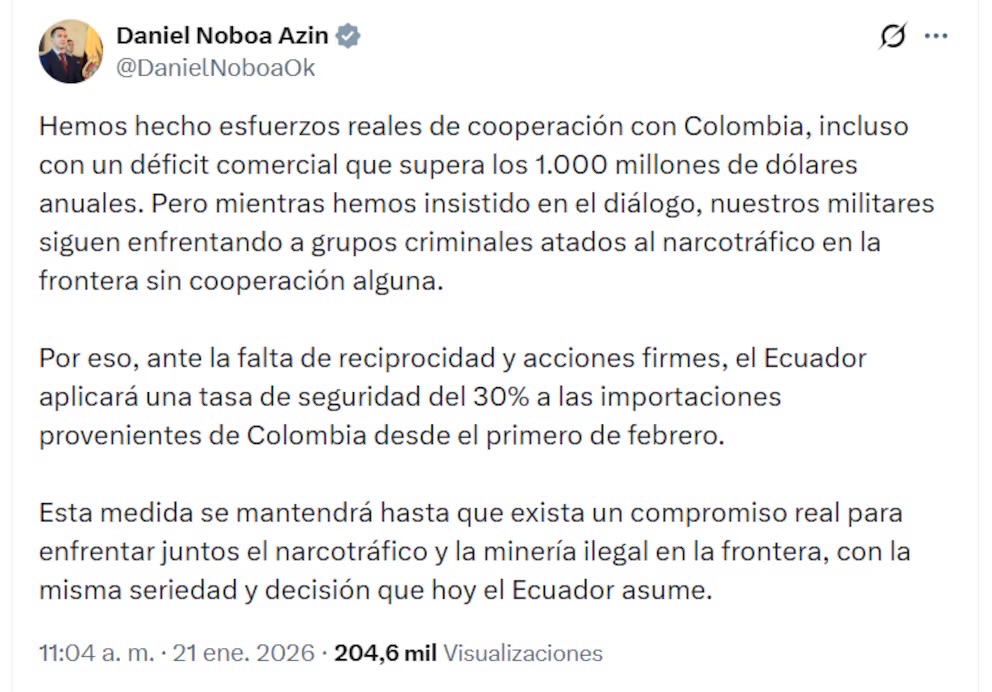 1. Ecuador impondrá un arancel del 30% a Colombia por seguridad, anuncia el presidente Daniel Noboa