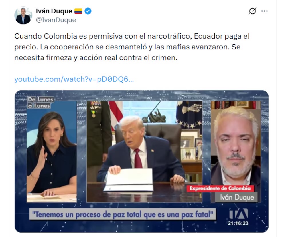 その一人が、コロンビアの元大統領であるイバン・ドゥケ(Iván Duque)である。ドゥケは、今回の関税措置は前任大統領グスタボ・ペトロ(Gustavo Petro)が推進してきた政策の不備に起因するものだと指摘した。ドゥケは、エクアドルのメディアであるテレアマソナス(Teleamazonas)のインタビューを引用する形で自身のSNSに投稿し、「コロンビアが麻薬密売に対して寛容であるとき、その代償を支払うのはエクアドルである。協力体制は解体され、犯罪組織が勢力を拡大した。今こそ断固とした姿勢と、犯罪に対する実効的な行動が必要だ」と述べた。