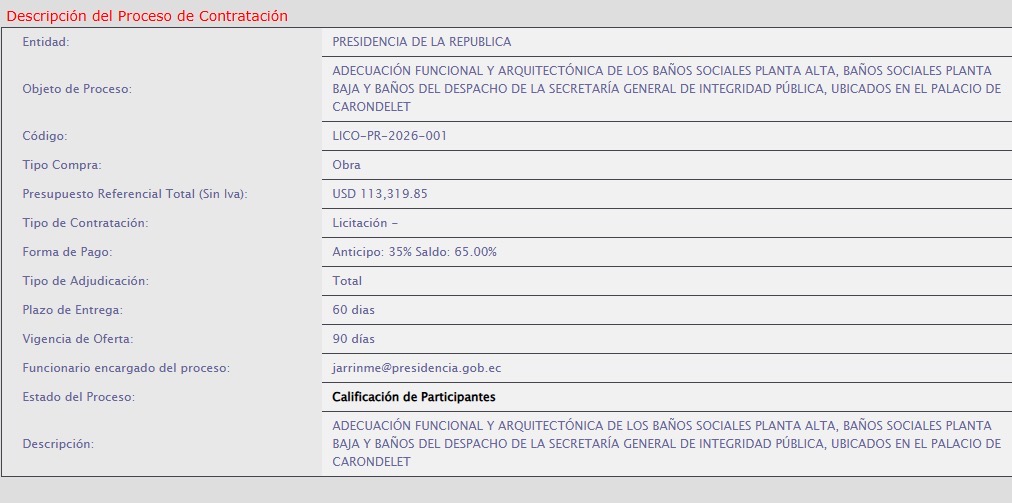 行政府の所在地であるカロンデレ宮殿(Palacio de Carondelet)において、上階および下階の共用浴室2か所と私用浴室1か所の全面改修が行われる。これに伴い、大統領府は公的資金から13万317米ドル(付加価値税込み)を支出する。