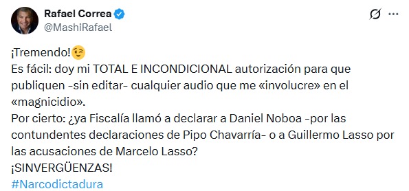 さらにコレアは、ウィルメル・チャバリアがビジャビセンシオ殺害は大統領ダニエル・ノボアの指示によるものだと主張していることを受け(詳細はこちら)、検察に対しノボアの事情聴取を求めた。あわせて、マルセロ・ラッソ・サアベドラ(Marcelo Lasso Saavedra)の告発に基づき、元大統領ギジェルモ・ラッソ(Guillermo Lasso)の召喚も要請した。