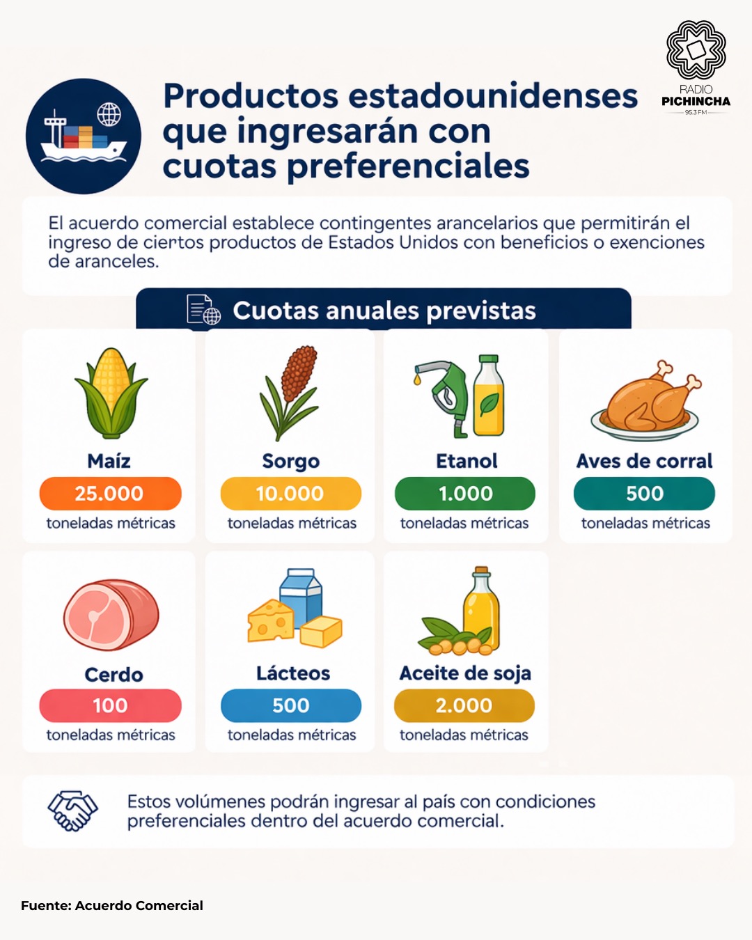 協定における批判の中心は、エクアドルが米国製品に対する関税を削減または撤廃し、米国農産品に優遇措置を与える点である。協定には、米国農産品向けの関税免除輸入枠(トウモロコシ、乳製品、豚肉、家禽など)が含まれており、テキストには具体的な割当(コンティンジェント)が明記されている。対象品目は以下の通りである。これらの品目には、米国輸出業者向けの特定割当と関税上の優遇が付与されている。