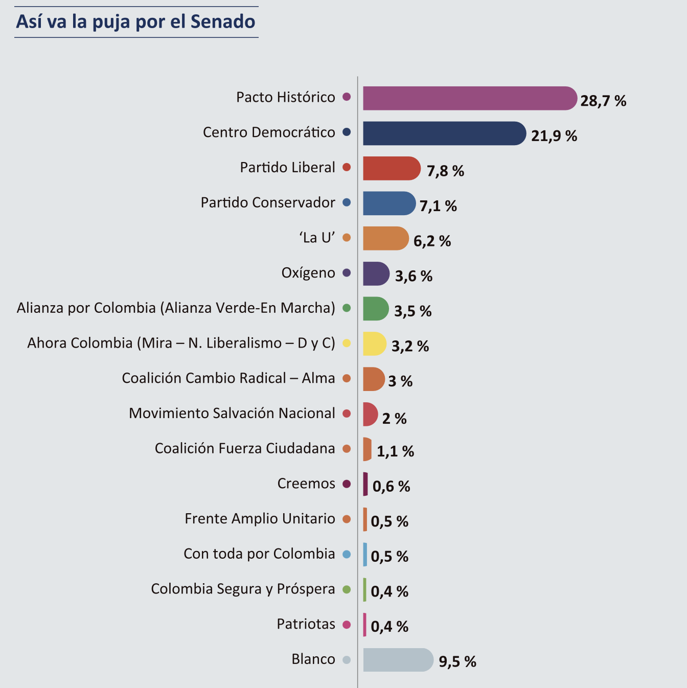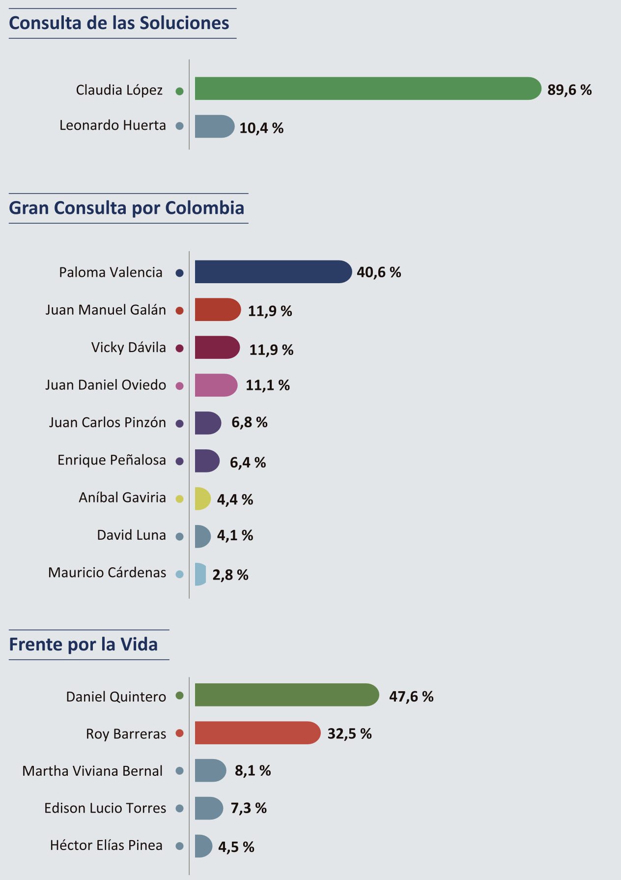 グアルモ社(Guarumo)とエコアナリティカ社(Ecoanalítica)が実施した最新世論調査によると同連合の予備選で前ボゴタ市長ロペスは89.6%の支持を獲得しており、対立候補のレオナルド・ウエルタは10.4%にとどまった。