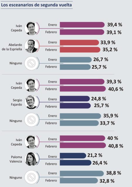 第一回投票で過半数が得られなかった場合の決選投票シミュレーションでは、イバン・セペダ上院議員が、どの候補者に対しても優位を保つ状況が示されている。