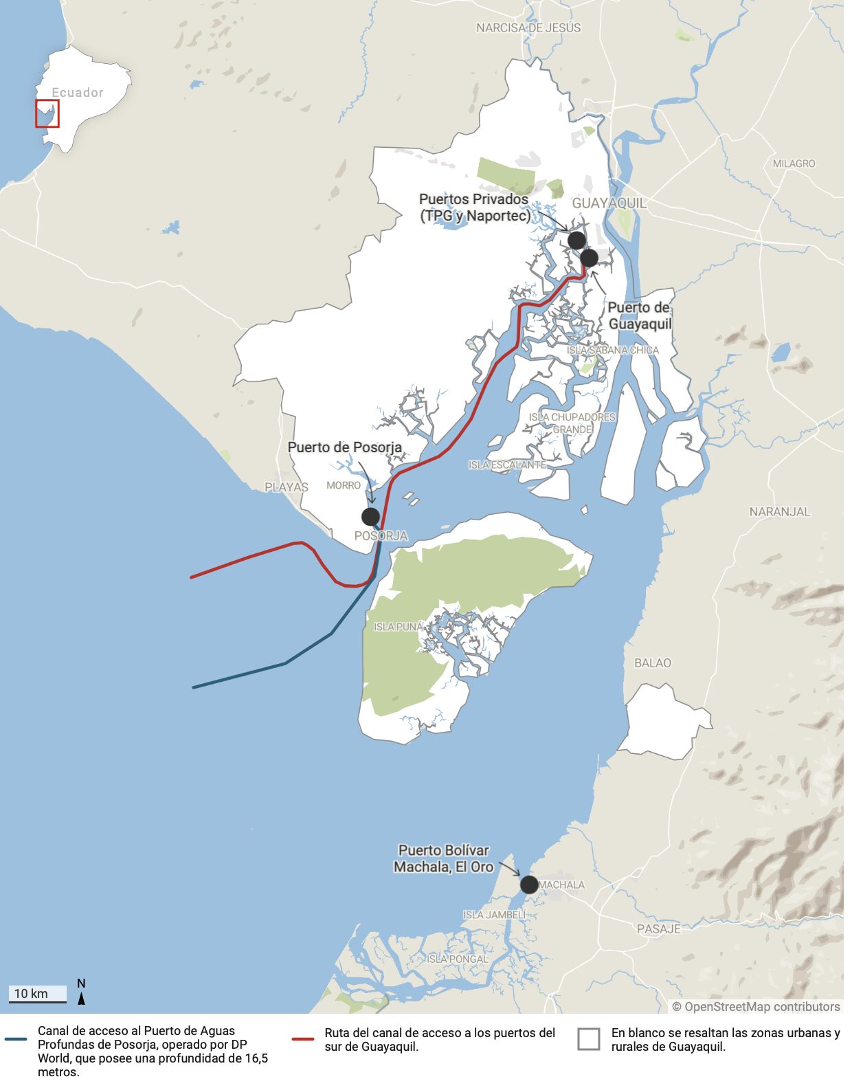 グアヤキル湾を通るグアヤキル南部およびポソルハ(Posorja)の港へのアクセス水路は商船がコカインによる汚染のリスクにさらされている。港内および港へのコンテナ検査の強化に伴い、麻薬を船舶に積み込む作業の一部は湾内の水域に拡大している。