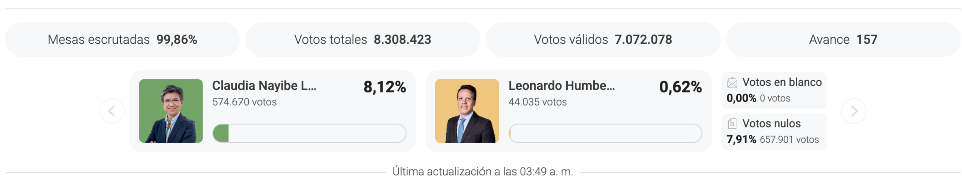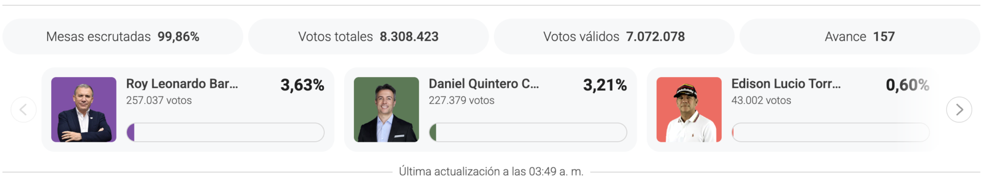 コロンビア国家市民登録庁(Registraduría Nacional del Estado Civil)が同日午後8時38分に発表した第55号速報によると、予備選への総投票数は6,913,272票に達した。右派連合のコロンビア大協議(La Gran Consulta por Colombia)は5,726,269票を獲得し、その予備候補であるパロマ・バレンシア・ラセルナ(Paloma Valencia Laserna)は3,160,242票を得た。この数字は、直前に行われた左派陣営の内部選挙と比較して大幅な増加を示している。