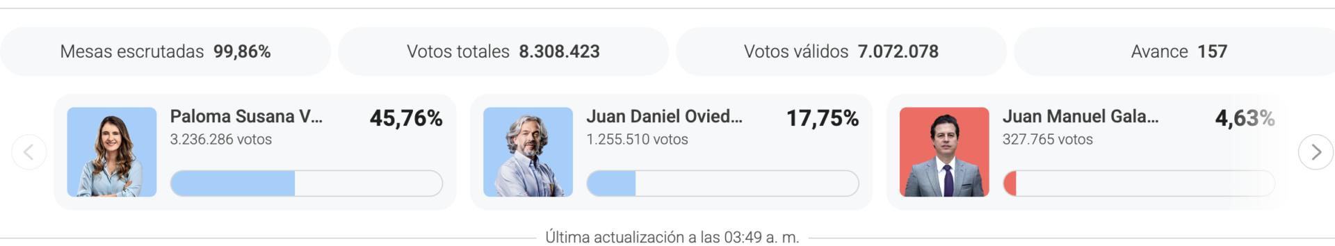 分析では、右派のバレンシアと元上院議員で現在は国家統計局長を務めるフアン・ダニエル・オビエドが本予備選の明確な勝者として挙げられる。バレンシアは右派候補として存在感を示し、オビエドも選挙戦における新たな勢力として注目を集めている。一方、バレラスとロペスは予備選で勝利したものの、支持基盤は比較的限定的とみられている。