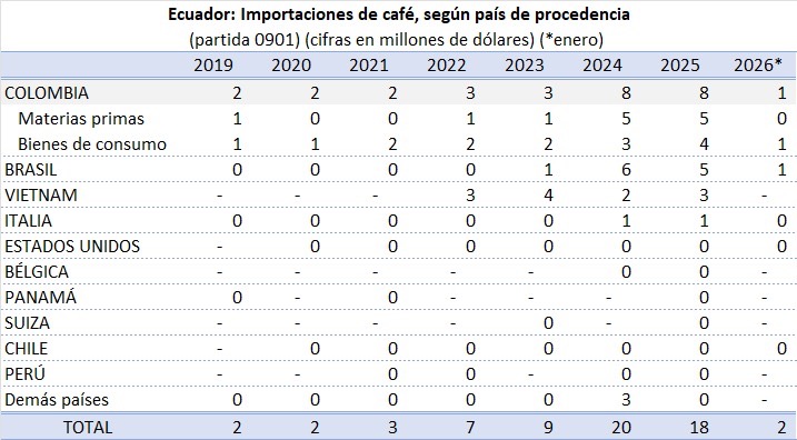 2024年および2025年、エクアドルは年間約800万ドル相当のコロンビア産コーヒーを輸入していた。さらに2026年1月時点では、危機深刻化直前にもかかわらず輸入額は100万ドル規模に達し、ブラジルやベトナムを上回る主要供給源となっていた。