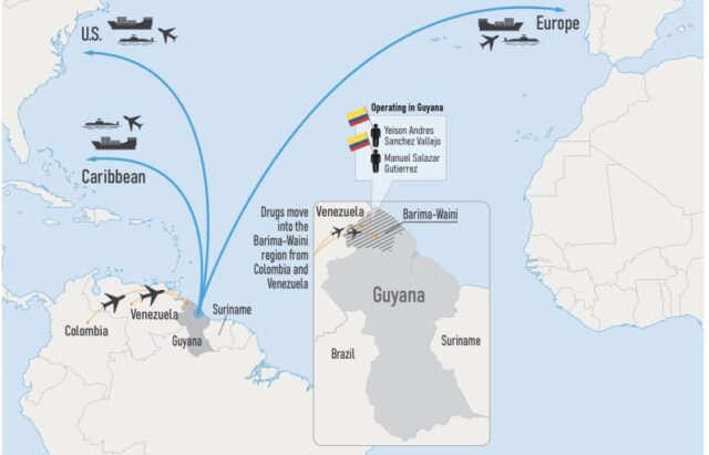 ガイアナは戦略的な立地と港湾における腐敗を背景に、南米産コカインの大西洋横断輸送やカリブ海地域への密輸において重要な中継拠点として機能している。ベネズエラやブラジルと国境を接し、陸路・海路・空路を含む複数の輸送経路を通じて、米国、カナダ、ヨーロッパ、西アフリカなどの需要市場へ薬物が運ばれる。