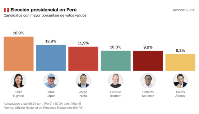 ケイコ・フジモリ(Keiko Fujimori)は次点候補であるラファエル・ロペス・アリアガ(Rafael López Aliaga)から4ポイント上回っており、決選投票進出がほぼ確定している。一方2位はまだ確定しておらず、他の3候補者との票差が非常に僅差となっている。そのため、今後の開票結果に注目が集まっている。