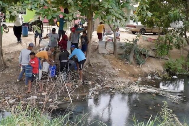 クマナ(Cumaná)の街中では、2人の男性、2人の女性、少年が水を求めて列を作っていた。住民は空のバケツを並べ、プラスチック椅子に座る者も立って待つ者もいる。一部のバケツには水を入れるのを待つペットボトルが入っていた。クマナでは料理用ガスと同様に、水も長期にわたって不足している。州政府は先月の地震で損傷したパイプラインが原因と説明するが、地元住民は長年の投資不足により供給が以前から不安定だったと訴えている。ある住民は、ごみの散乱する小川から水を汲んでいると語った。