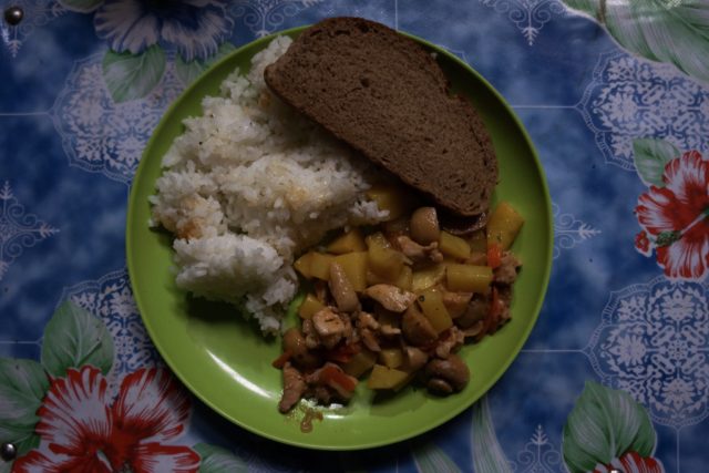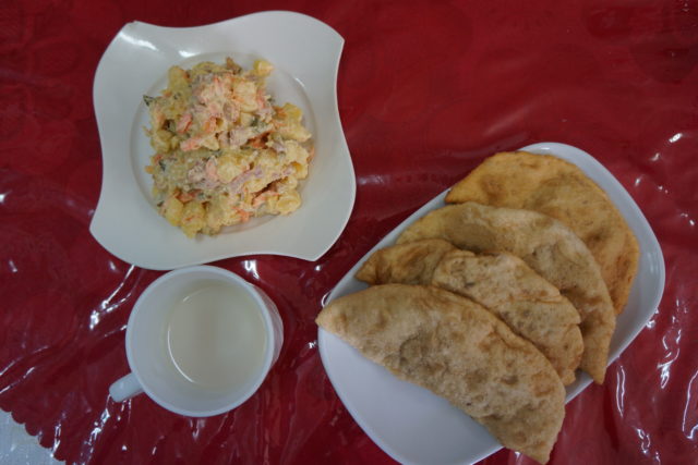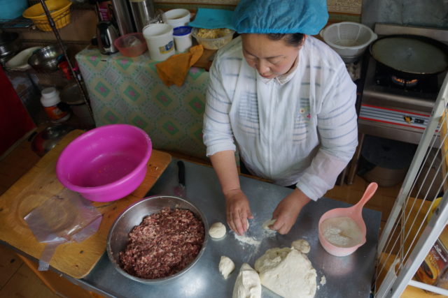 After visiting the cliffs, we headed to a nearby village to take a shower. Then, it was time for lunch. We had a traditional Mongolian dish called khuushuur. Khuushuur is a type of dumpling, and the lady who prepared it cooked them with a perfect rhythm. The filling is made from mutton, mixed with onions and garlic, and seasoned with salt and other spices. It was delicious. The khuushuur were quite large, so three dumplings were more than enough for me.