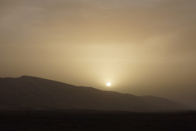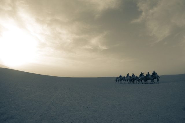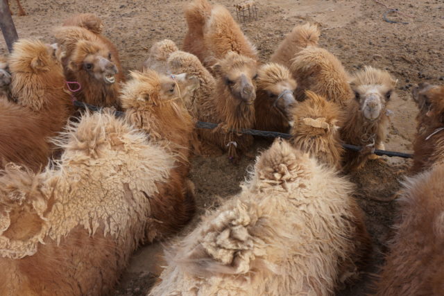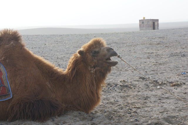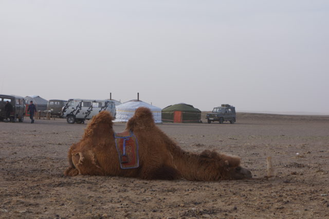 In the morning, we had clear blue skies overhead. But as time passed, clouds began to cover the sun, and the weather took a turn for the worse. The temperature suddenly dropped, and we couldn’t stop shivering from the cold. When we arrived at Khongoryn Els, the largest sand dune in Mongolia, the wind picked up, blowing the fine sand into the air. After a short break with a cup of coffee, we set off on our camel riding tour.